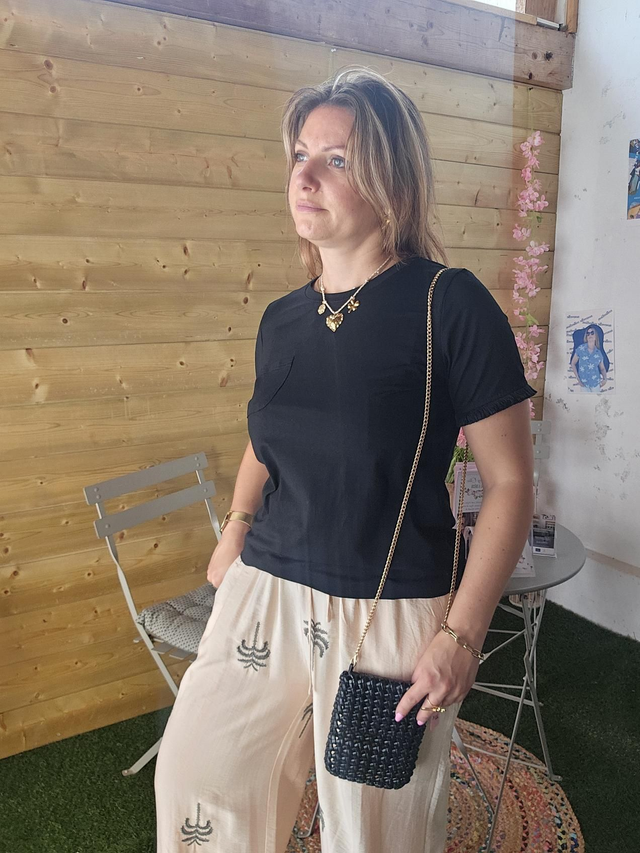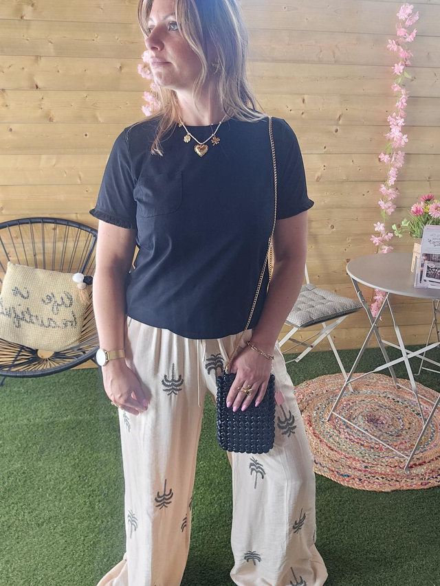 Pantalon fluide beige broderie palmier kaki